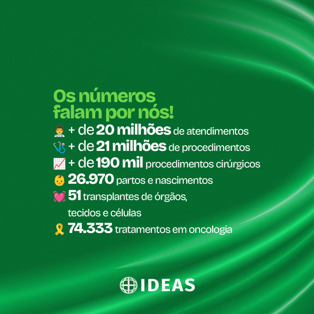 Se no aniversário de quatro anos, o IDEAS administrava 10 contratos, hoje são mais de 30 projetos, desde unidades básicas de saúde (UBSs), UPAs 24h e Samus até hospitais de pequeno, médio e de grande porte e de referência internacional, como o Instituto Estadual do Cérebro Paulo Niemeyer, no Rio de Janeiro. Organização social sem fins lucrativos, os projetos são geridos em parceria com os poderes públicos municipal, estadual e federal. Por mês, o IDEAS administra R$ 154 milhões em recursos oriundos de prefeituras, Estados e União. “Esses números reforçam a relevância do Instituto na gestão de saúde pública no Brasil e o seu compromisso com a inclusão e a eficiência no atendimento à população”, destaca o diretor Sandro Demetrio.