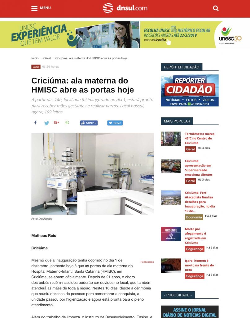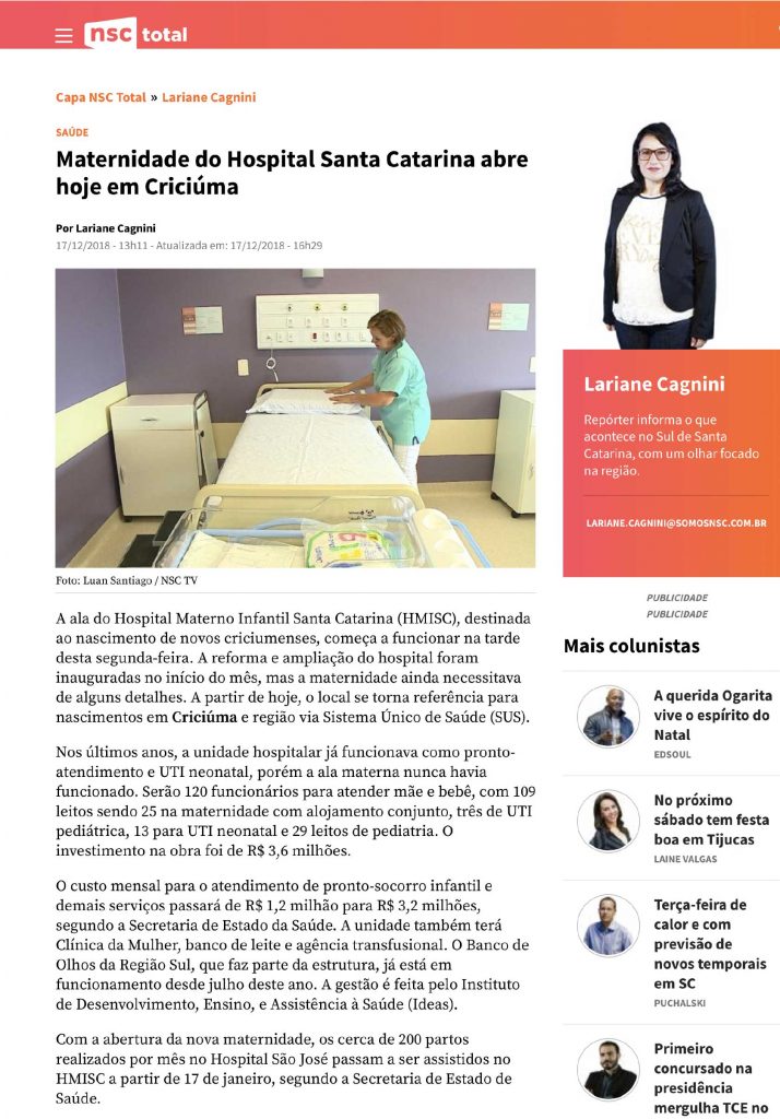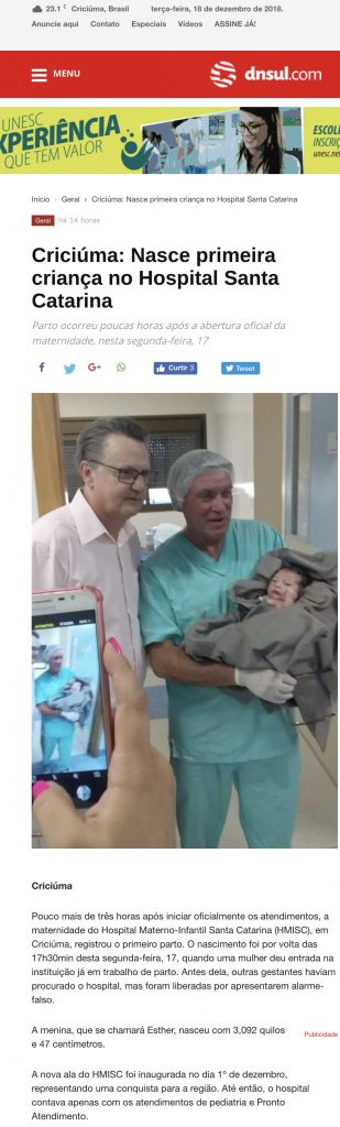 Jornais da região destacam a abertura da maternidade do HMISC em suas matérias nesta segunda-feira, 17 de dezembro de 2018.